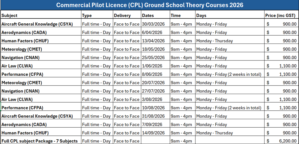Our CASA Commercial Pilot Licence (CPL) Ground Theory Courses provide comprehensive preparation for the Australian Civil Aviation Safety Authority (CASA) aeronautical knowledge examinations.